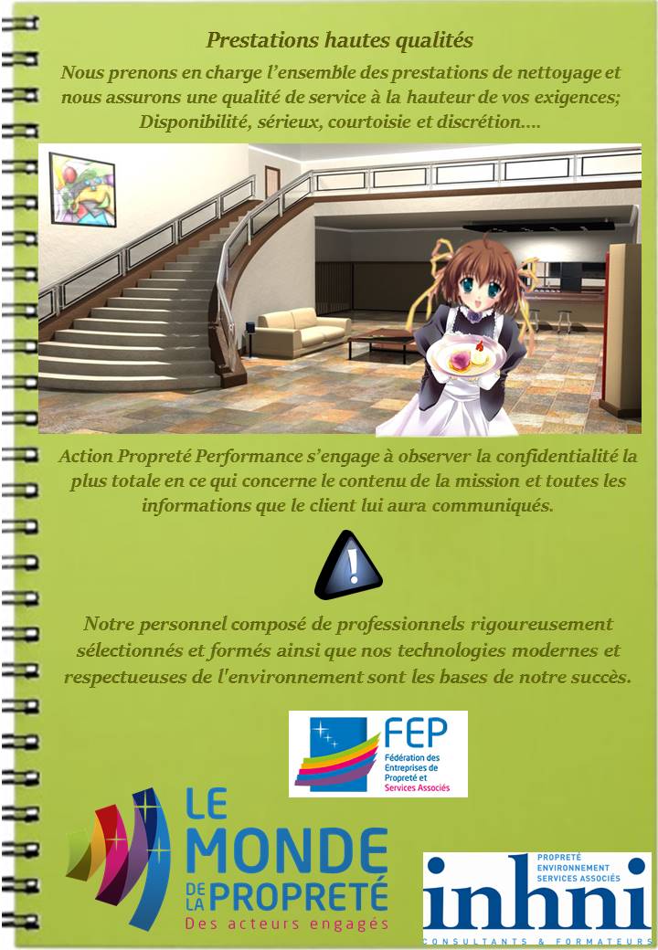 ACTION PROPRETÉ PERFORMANCE offre ses services sur l'ensemble du département. Nettoyage événementiel ou longue durée. Nettoyage villa, d'habitations privées. Nettoyage et entretien, de bureaux, magasins, restaurants. Entretien des tapis et moquettes. La gestion des circuits de linge propre et de linge sale. service conciergerie,checkin/checkout Un travail soigné, précis et de grande qualité. Devis gratuit
